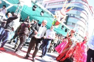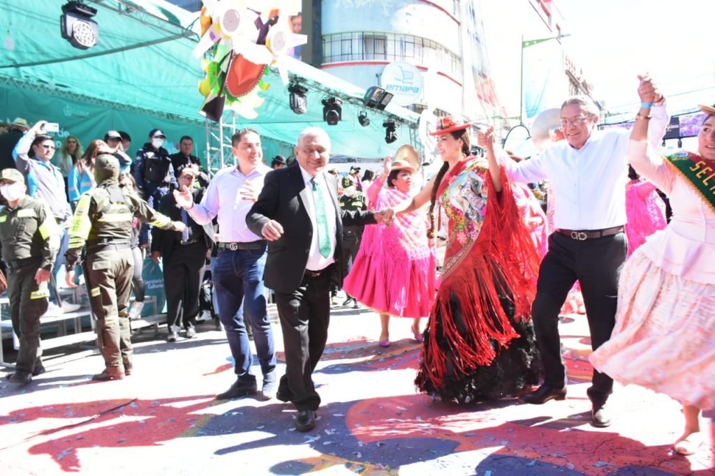 Al compás de bombos y platillos de la Morenada Unión Comercial, el alcalde Arias y Carla Ortiz bailaron en el palco junto a los danzarines de la fraternidad.