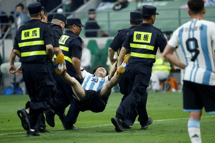 El aficionado chino esquivó la seguridad y saltó al campo para abrazar a Messi cuando este se dirigía a cobrar un tiro de esquina. Los guardias trataron de agarrarlo, pero el fanático resultó ser más veloz.