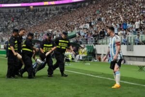 En los videos que captaron el hecho, se observa como el seguidor chino del astro argentino corre, abraza a Messi, sigue corriendo, saluda al arquero Emiliano ‘Dibu’ Martínez y le da la vuelta a la cancha hasta que se cae del cansancio y es atrapado por la seguridad del estadio.