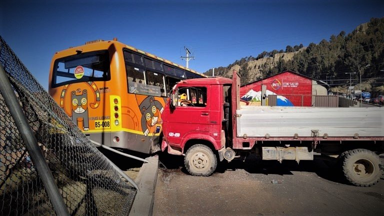 La Alcaldía de La Paz informó que un camión cargado de ladrillos impactó este sábado la puerta del garaje del patio Incallojeta de La Paz BUS, también causó destrozos en un bus ChikiTiti que se encontraba en su interior, y aseguró que no se reportaron heridos en el incidente.