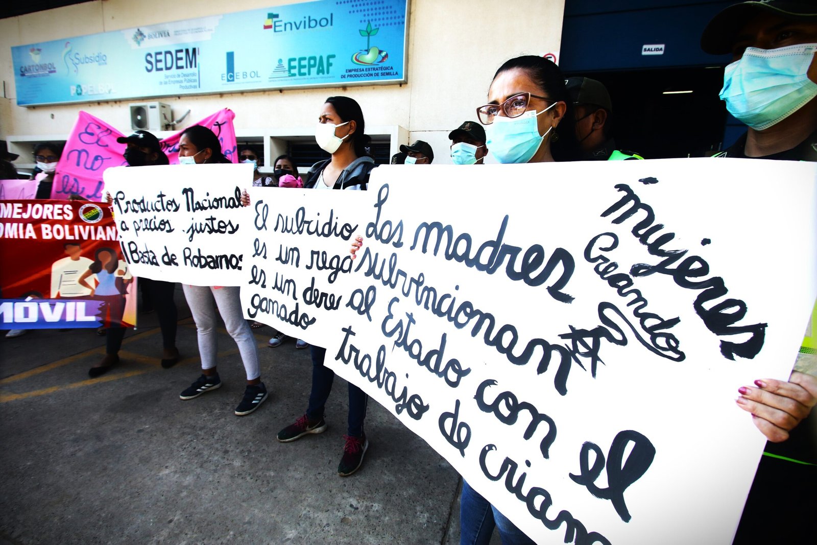 Graciela hace fila sudando y agarrándose la cadera para descansar el peso de su vientre de 7 meses de embarazo. Delante de ella, unas 30 mujeres esperan para recibir los paquetes que entrega el subsidio prenatal y lactancia. Es un galpón caliente donde funciona la entrega de productos del Servicio de Desarrollo de las Empresas Públicas Productivas (Sedem) en Santa Cruz de la Sierra.