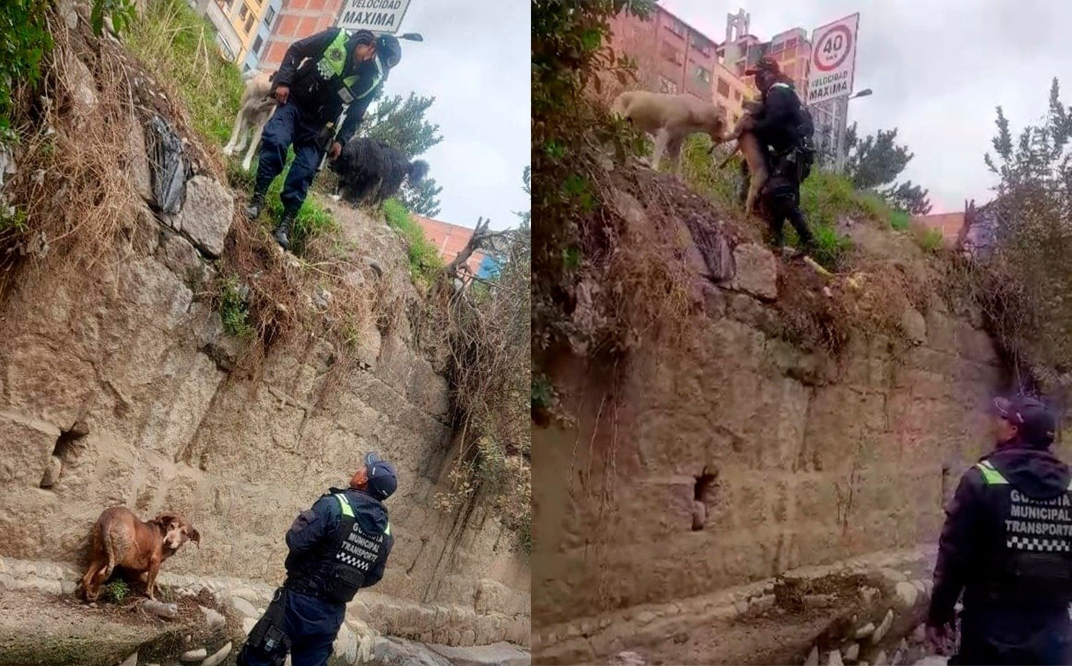 Mojados, asustados y temblando de frío, así encontraron los efectivos de la Guardia Municipal de La Paz a dos perros que estaban atrapados en el río Choqueyapu, a la altura del inicio de la autopista La Paz – El Alto, este martes por la mañana. Los rescataron y pusieron a buen recaudo.