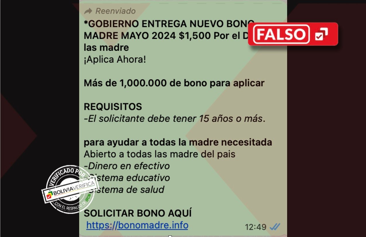 Es decir, el sitio promocionado no tiene ninguna relación con la entrega de un bono a favor de las madres en Bolivia.
