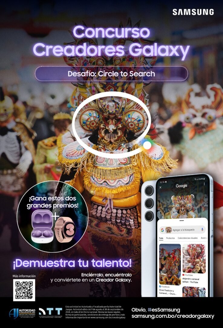 Para participar, los bolivianos deben compartir su creación en Instagram, etiquetando a Samsung Bolivia (@samsung.bolivia) y a uno de los cuatro creadores de contenido que actúan como jueces: Carlos Marquina (@marquina.ok), Sarah Sanabria (@sarah_andrea_sanabria), Facio (@facio_o) y Pablo Montaño (@paulusdamianbo). Además, las publicaciones deben incluir los hashtags #CircleToSearch, #GalaxyAI y #withGalaxy para ser consideradas en el concurso.