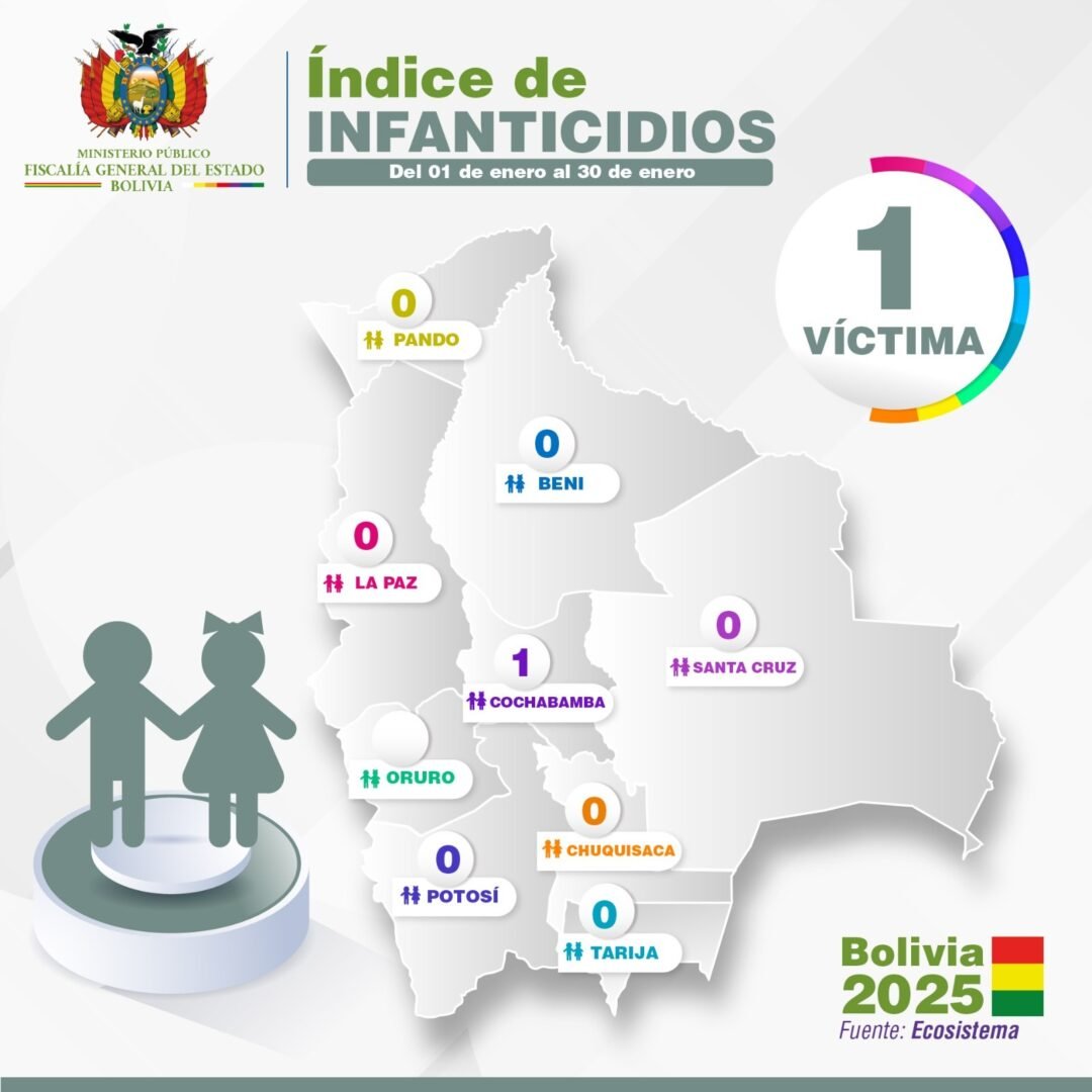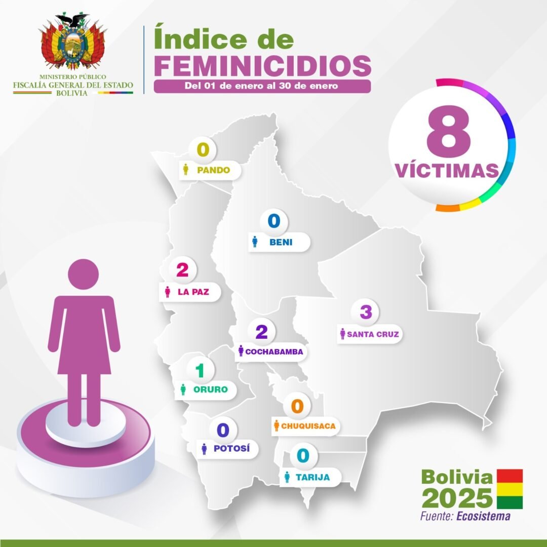 “Tenemos a la fecha ocho hechos de Feminicidio y un Infanticidio, evidentemente llama la atención de mayor incidencia de casos en el eje central como Santa Cruz, Cochabamba y La Paz; sin embargo, ante un hecho tenemos nosotros la obligación de poder esclarecer, de poder condenar a estos feminicidas y a estos infanticidas, siempre y cuando tengamos la prueba contundente para que un Tribunal de Sentencia pueda dar la pena máxima”, sostuvo Mariaca.
