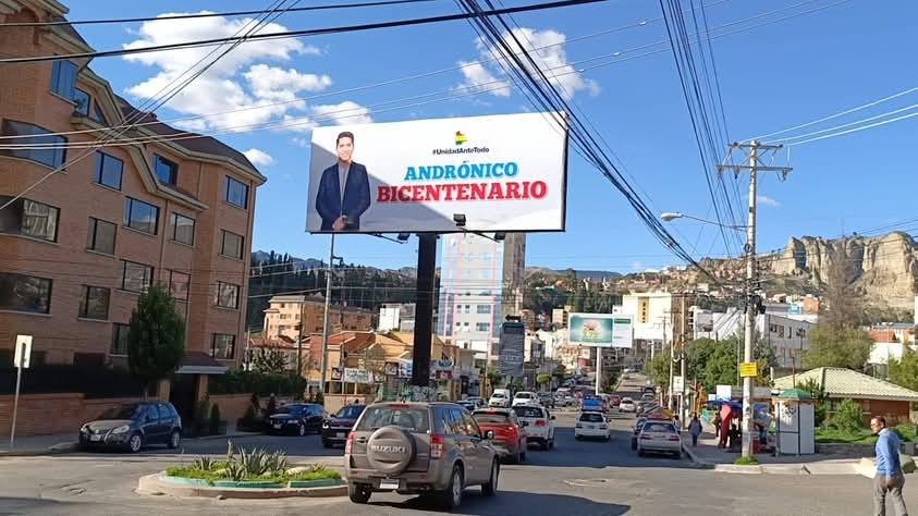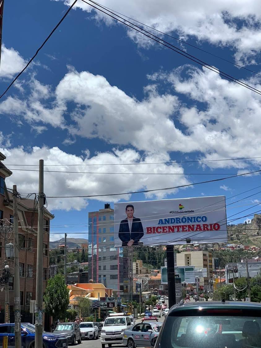 Sorprende una valla publicitaria con la imagen de Andrónico Rodríguez, presidente de la Cámara de Senadores, quien día antes indicó que el “único candidato es Evo Morales” y que él no está en campaña.