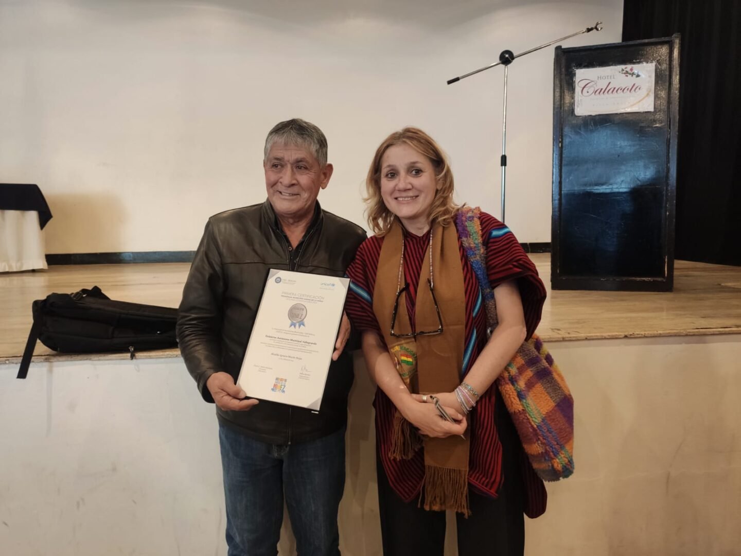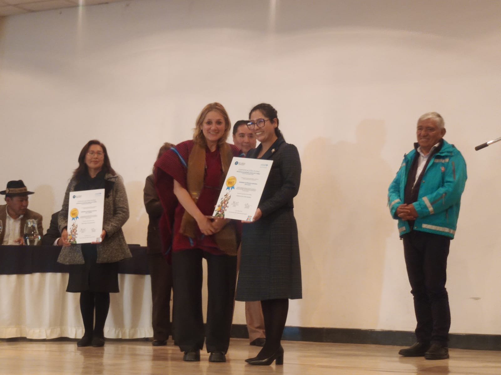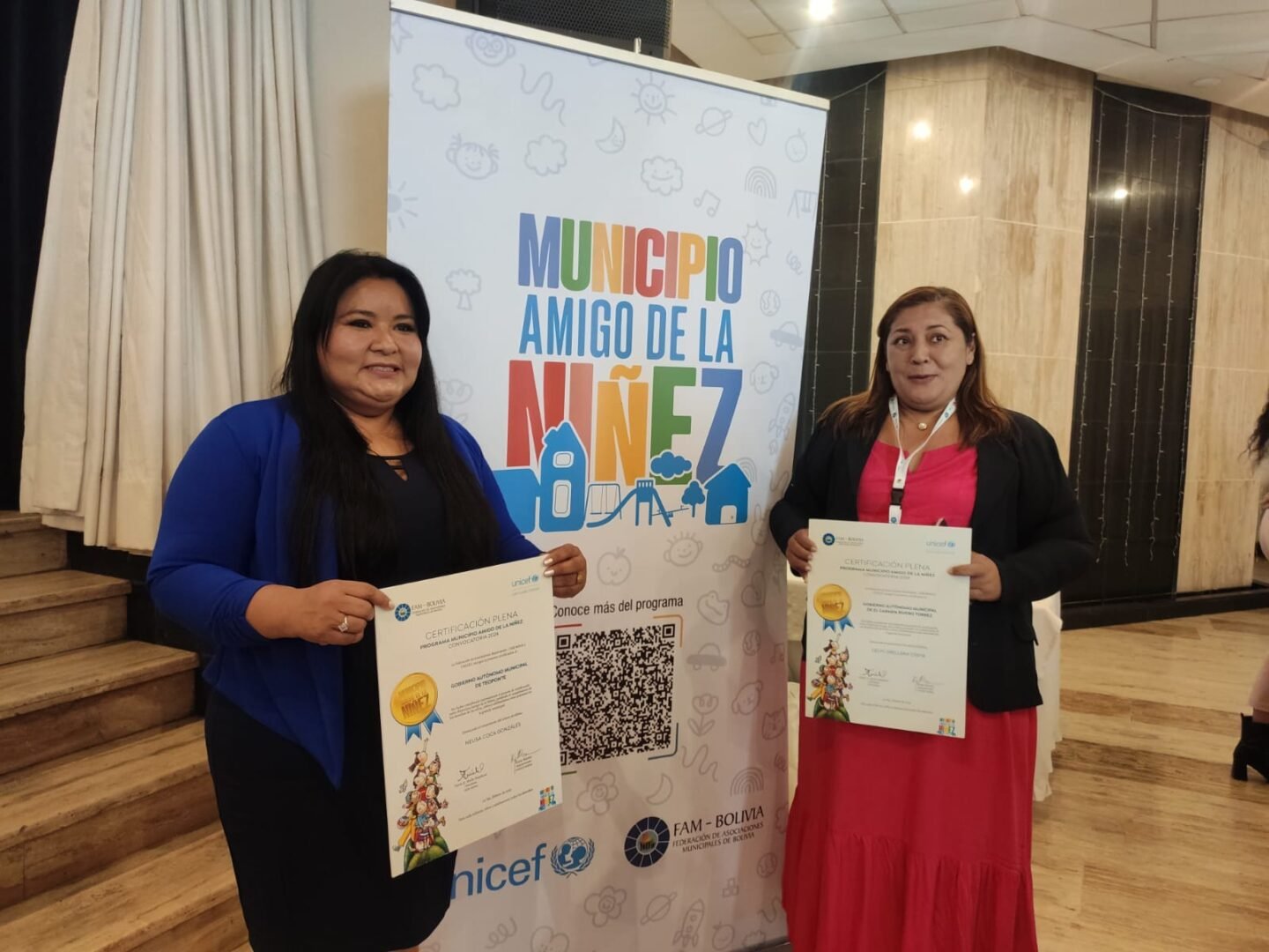 El acto de entrega de certificados estuvo presidido por el presidente de la FAM Bolivia, Flavio Merlo Maydana; la representante de UNICEF en Bolivia, Katya Marino, y alcaldes de diferentes municipios, entre ellos, Iván Arias, de La Paz, y Eva Copa, de El Alto, quienes recibieron la certificación plena por su trabajo en beneficio de la infancia, niñez y adolescencia de sus respectivos municipios.