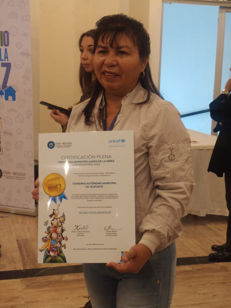 “En UNICEF estamos convencidos que, después de la familia, los gobiernos municipales juegan un rol fundamental en el cuidado, protección y ejercicio de los derechos de la niñez. Este logro es el resultado del compromiso y liderazgo de las autoridades municipales, junto al esfuerzo de sus equipos técnicos. Su dedicación, pasión y trabajo conjunto han hecho posible la certificación como ‘Municipio Amigo de la Niñez’. La verdadera amistad trasciende las palabras y se demuestra con acciones que transforman vidas. Sigamos trabajando unidos para que, algún día, podamos decir con orgullo que en Bolivia todos los municipios son, sin duda alguna, amigos de la niñez”, afirmó Katya Marino, representante de UNICEF.