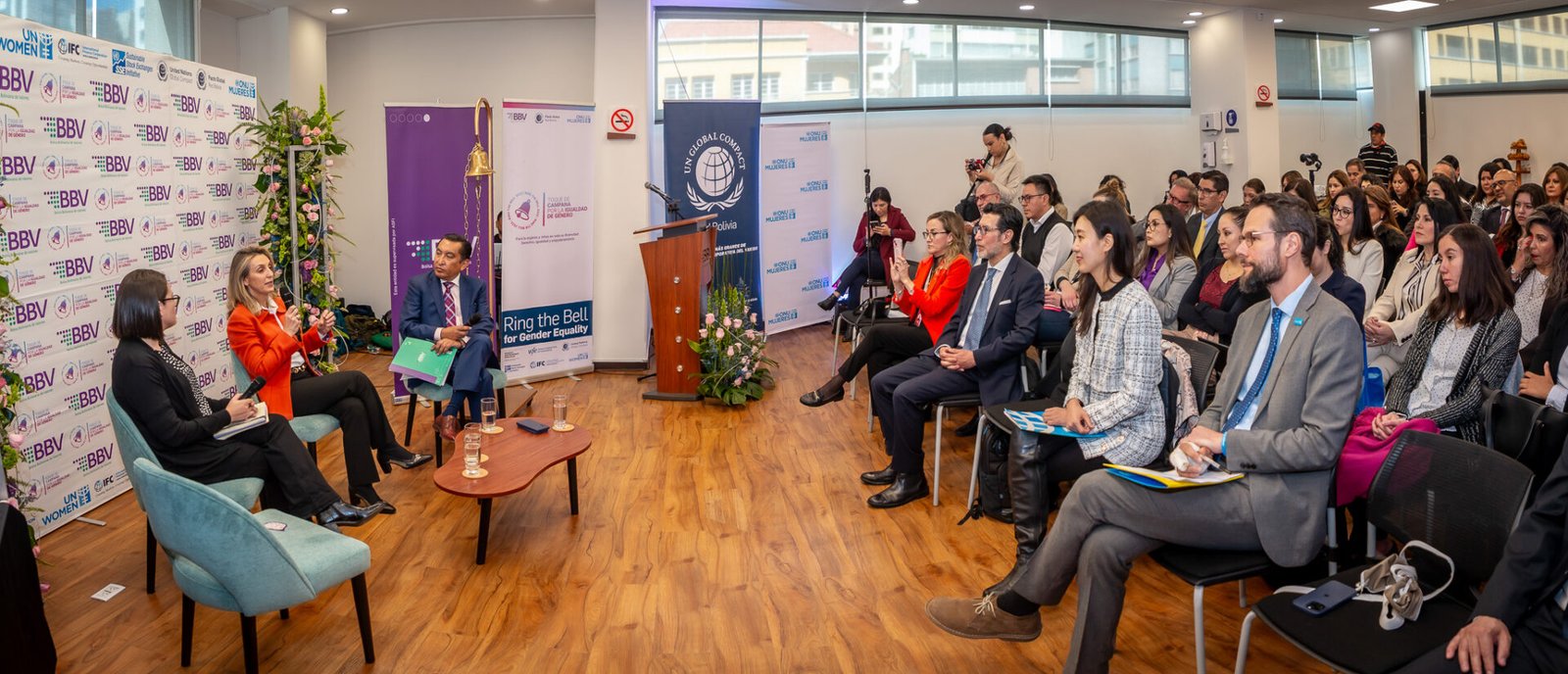 Líderes del sector financiero y empresarial compartieron acciones concretas para cerrar las brechas de género y generar oportunidades para la sociedad en un espacio realizado por sexto años gracias a la Bolsa Boliviana de Valores (BBV) en alianza con ONU Mujeres y Pacto Global Red Bolivia.