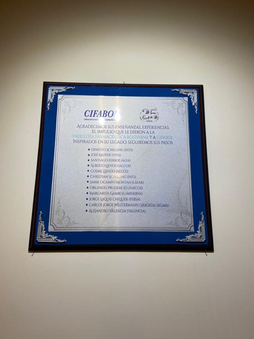 En el marco del evento, también se realizó un emotivo homenaje póstumo a los fundadores de CIFABOL, quienes hace 25 años cimentaron la base de una organización que actualmente aglutina a las principales empresas farmacéuticas del país. Entre los distinguidos están: Ernesto Schilling (INTI), José Kieffer (VITA), Santiago Ferrer (ALFA), Alberto Liendo y Cosme Liendo (ALCOS).