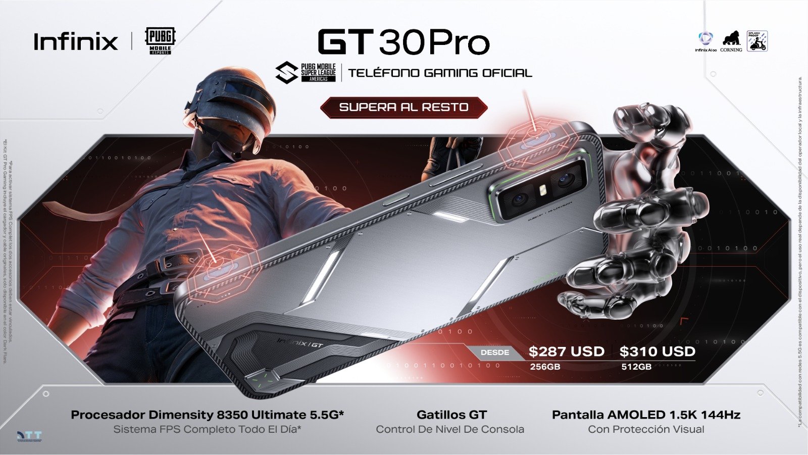 - Otras espeficaciones: El nuevo INFINIX GT 30 PRO, viene incluido con Corning Gorilla Glass, además de una certificación IP64 que lo hace resistente a salpicadura y polvo, además, ser que su pantalla es adaptable para toques húmedos y/o grasosos.