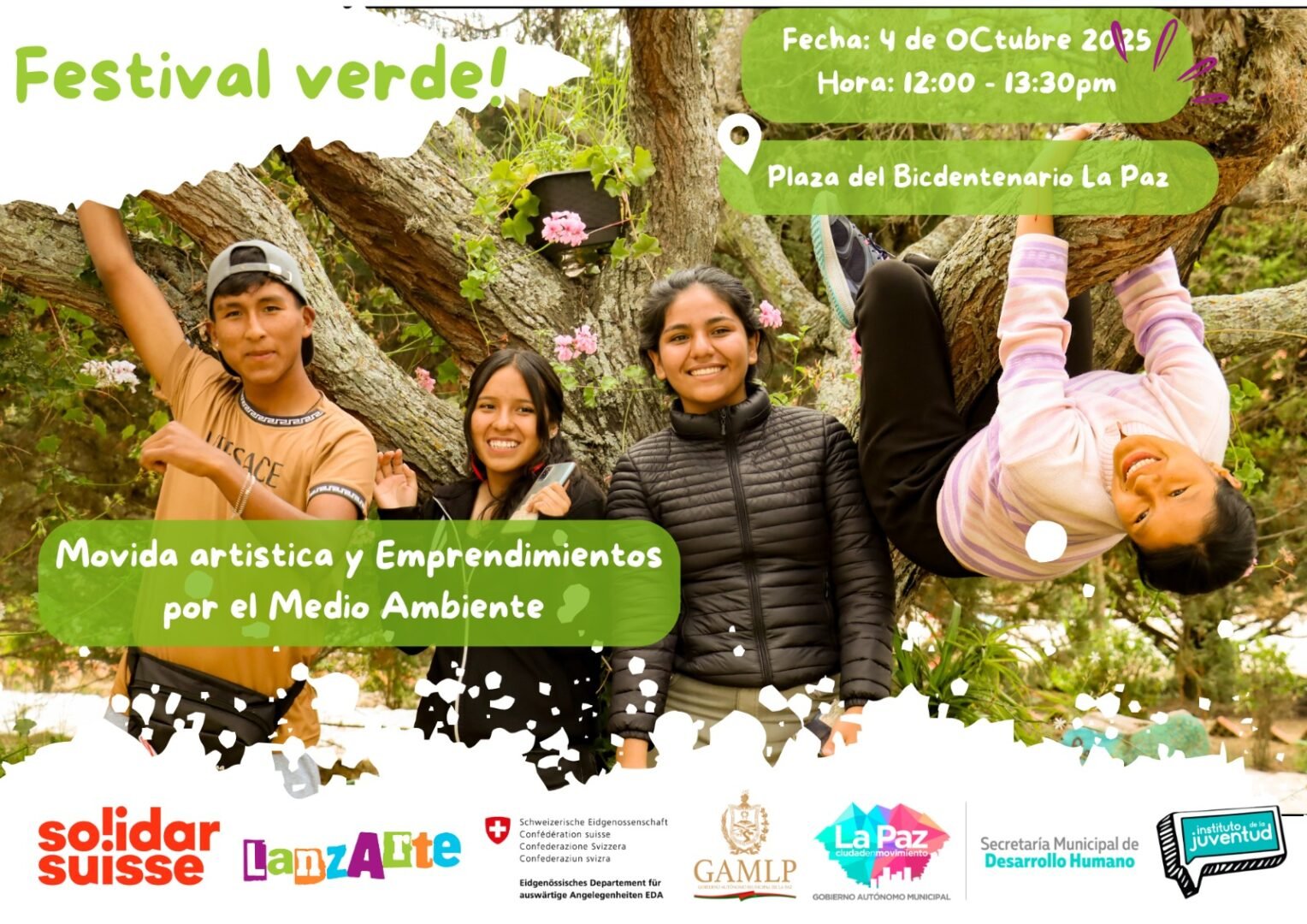 Con el objetivo de concientizar sobre el cuidado del medio ambiente y la importancia del Reciclaje, más de un centenar de jóvenes de diferentes municipios de Bolivia desarrollarán el “Festival Verde”, una movilización artística y de emprendimientos verdes, por el medio ambiente y el uso responsable de los recursos naturales. La intervención Artística tendrá lugar el sábado 4 de octubre de 12:00 a 13:30 horas en la Plaza del Bicentenario de La Paz, en medio de una feria de emprendimientos con enfoque verde, es impulsada por el proyecto LanzArte de Solidar Suiza y el Instituto de la Juventud del GAMLP.