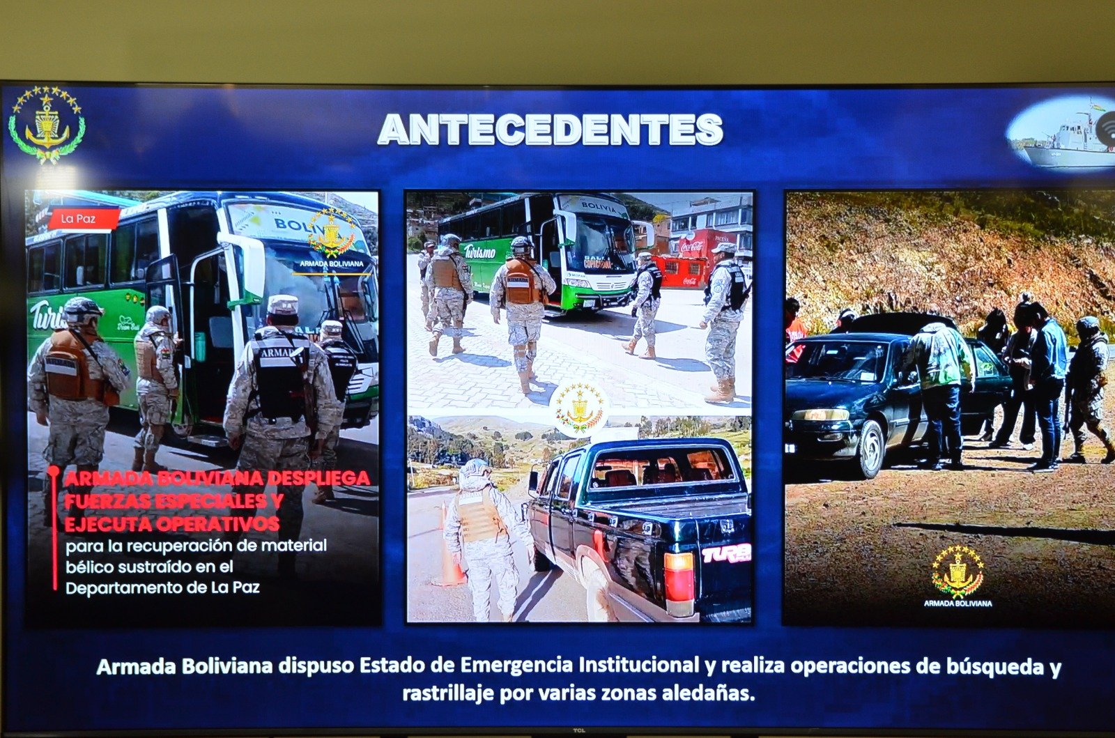 Tras conocerse el hecho, la Armada activó un estado de emergencia institucional, desplegando 246 efectivos en La Paz y 380 en regiones fronterizas, además de activar controles en puntos estratégicos y coordinar acciones con autoridades del Perú. “Se han establecido puntos de control en las zonas fronterizas… con la finalidad de evitar que estos elementos irregulares puedan trasladar el armamento fuera del país”, explicó.